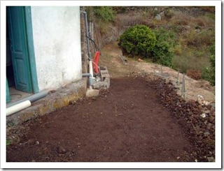 Hole ready to take the new door step. What the photos don’t quite show is that when cutting the old frame out which was concrete, the cutter makes so much dust that a times I couldn’t see Helen inside the kitchen, and as the wind was not quite in the right place the dust got sucked into the house and left a thin film over everything.